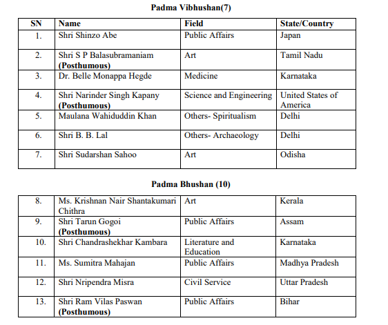 The list comprises 7 Padma Vibhushan 10 Padma Bhushan and 102 Padma Shri Awards. Shinzo Abe gets Padma Vibhushan Ram Vilas Paswan Padma Bhushan. As of 2021 the award has been bestowed on 1280 individuals which include 23 Posthumous and 99 Non-Citizen Recipients.